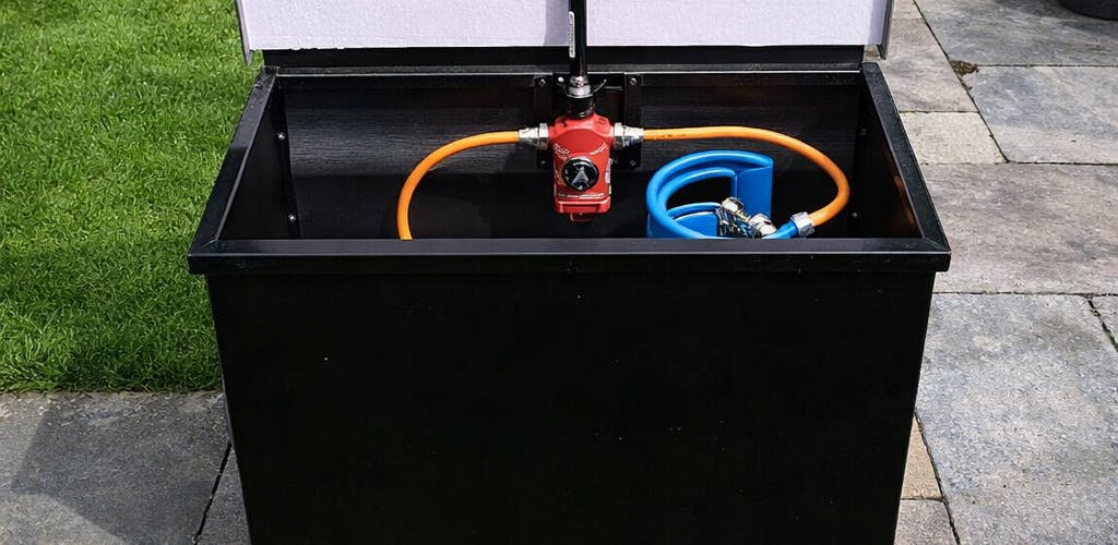 - Plaatsing van de gasflessen: buiten in een stevige, brandwerende kast of omkasting met goede ventilatie, beschermd tegen zon, wind en regen.
